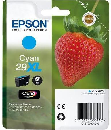 Epson 29XL (T2992) on alkuperäinen syaani mustekasetti, joka on suunniteltu erityisesti pitkäkestoisen ja korkealaatuisen tulostuksen tarpeisiin. Tämä suuremman kapasiteetin (6,4 ml) patruuna tarjoaa riittoisuuden noin 450 sivulle 5 % peittoasteella, mikä tekee siitä ihanteellisen vaihtoehdon käyttäjille, jotka tulostavat usein ja haluavat vähentää kasettien vaihtamisen tarvetta.