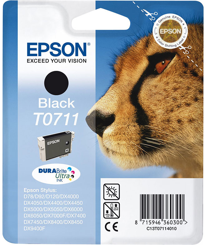 Epson T0711 on alkuperäinen musta mustekasetti, joka on suunniteltu tarjoamaan luotettavaa ja korkealaatuista tulostusjälkeä