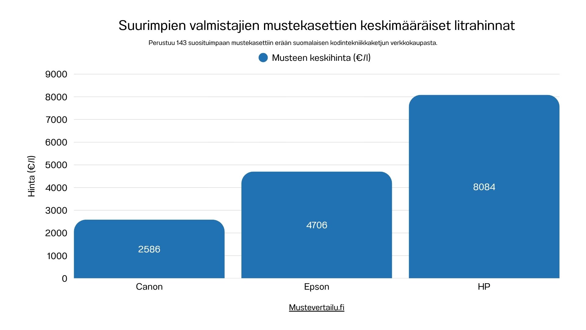 Epsonin musteiden keskihinta on noin 4 706 € per litra, kun taas HP:n muste on selvästi kalleinta, keskimäärin 8 084 euroa litralta.
